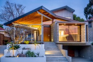 เดินขึ้นมาบนบ้านจะพบกับ ส่วนของบันไดทางขึ้นของบ้านสไตล์มินิมอล สำหรับบ้านหลังนี้ส่วนของประตูบ้านเป็นจะเป็นประตูบานกระจกสไลด์แบบกระจกใส ทำให้มีแสงที่สามารถส่องเข้ามาภายในห้องโถงได้ดี ทำให้ห้องไม่ทึบดูโปร่งโล่งสบายตา ส่วนของเฉลียงหน้าบ้านเป็นมุมเล็กๆ ที่วางเก้าอี้เล็กๆ ไว้นั่งเล่นด้านนอกได้อีกด้วย